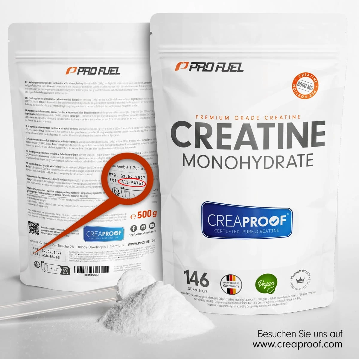 ProFuel CreaProof® Creatine Monohydrate to kreatyna monohydrat w proszku z unikalnym certyfikatem czystości CreaProof® – każda pojedyncza partia jest badana przez niezależne niemieckie laboratorium w 15-stopniowym procesie kontroli, a certyfikat jest publicznie dostępny przez QR kod na opakowaniu. Czystość 99,99%, porcja 3,41 g dostarcza 3000 mg czystej kreatyny. Bez smaku, bez barwników, 100% wegańska. Dostępna w ekonomicznych woreczkach doypack 500 g (146 porcji) i 1 kg (292 porcje).